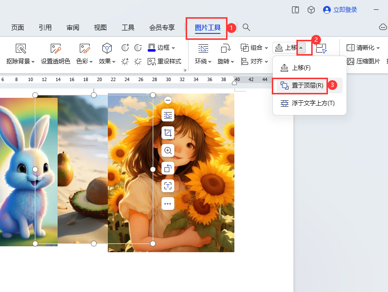 2、点击图片工具,点击上移后的三角形,点击置于顶层。