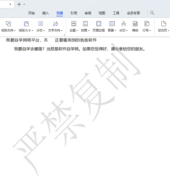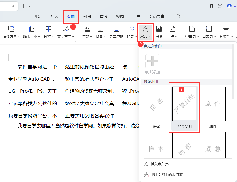 2、点击页面菜单,点击水印,选择严禁复印水印。