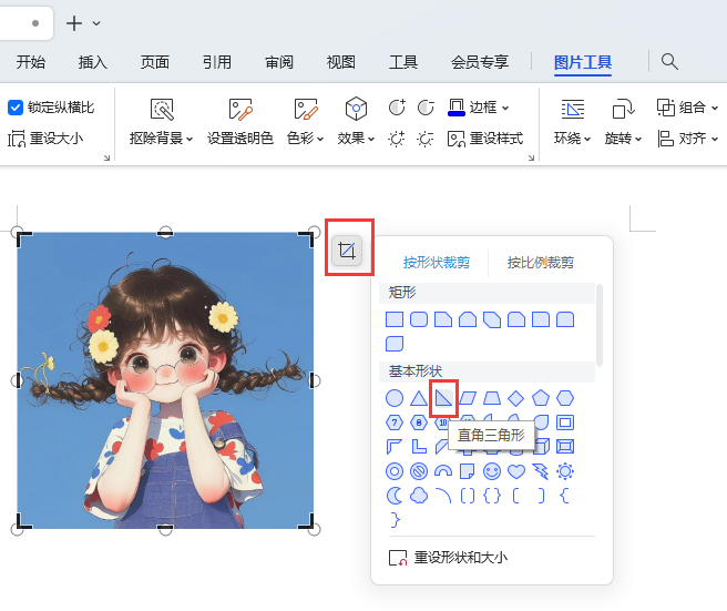 2、选中图片对象,点击裁剪里面的直角三角形。