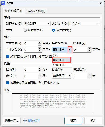 3、弹出段落面板,点击特殊格式,选择首行缩进。