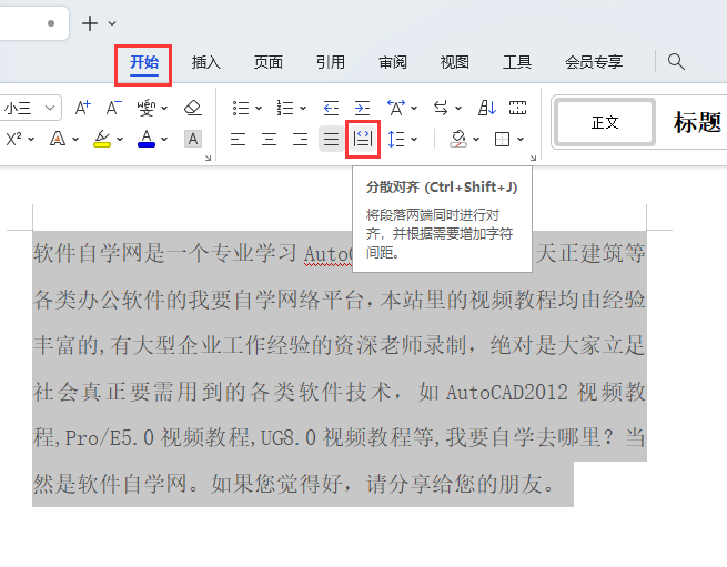 2、选择所有文字内容,点击开始菜单,点击分散对齐。