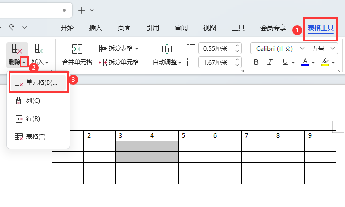 2、然后点击【表格工具】,点击删除的【三角形】,点击【单元格】。