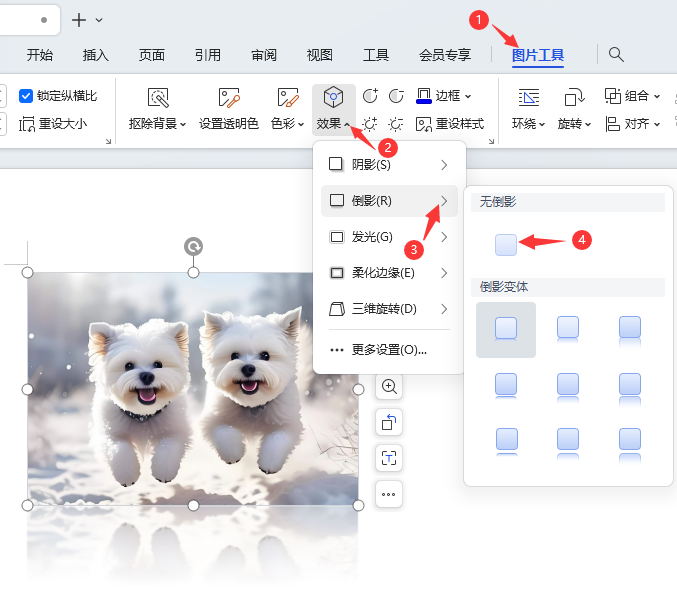 2、点击图片工具,点击效果里面的倒影,点击无倒影设置。