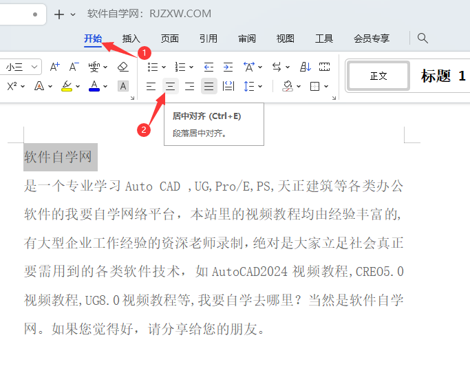 2、点击开始菜单,再点击居中对齐或是按CTRL+E组合键。