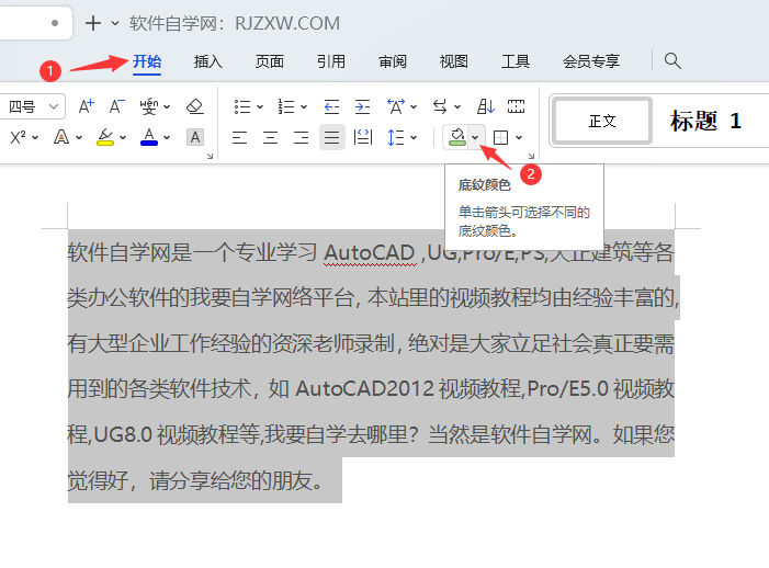 2、点击【开始】菜单,点击【底纹颜色】选项。