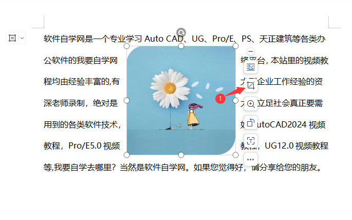 1、选择图文中的【图片对象】。点击图片旁边的【裁剪工具】。