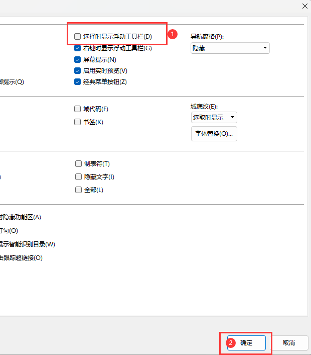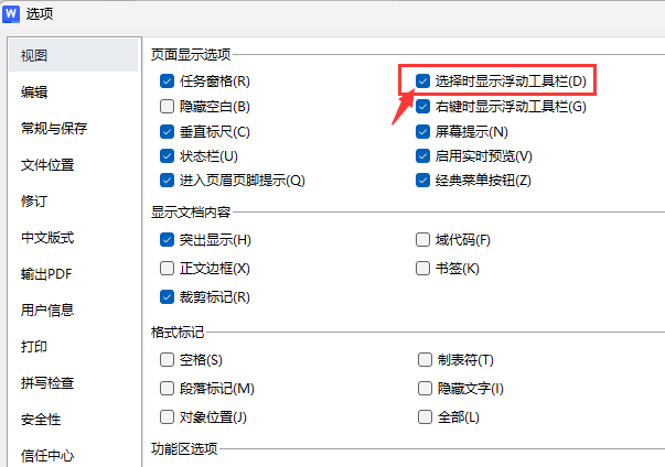 3、在选项的视图中,找到选择时显示浮动工具栏的选项。如下图: