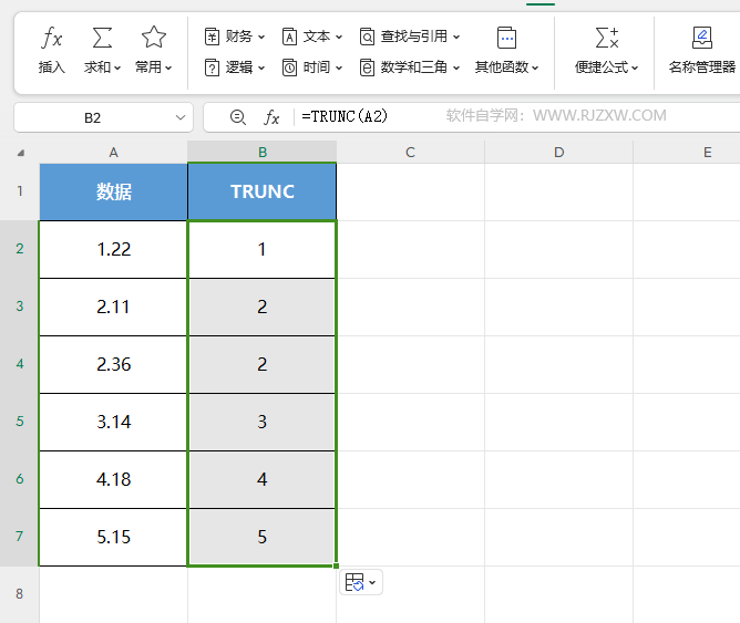 4、这样就用TRUNC函数提取了整数。效果图: