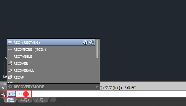 3、在下面命令行中,输入REC,也可以打开CAD矩形工具。
