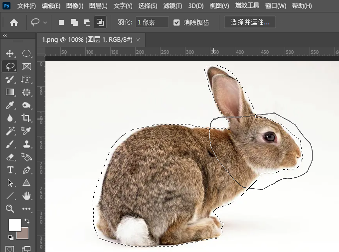 1、打开PS软件,打开素材照片并用套索工具选择兔子对象。如下图: