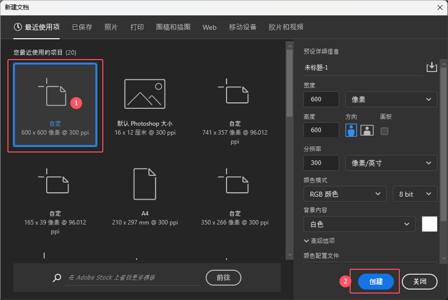 2、选择600x600像素,点击创建。