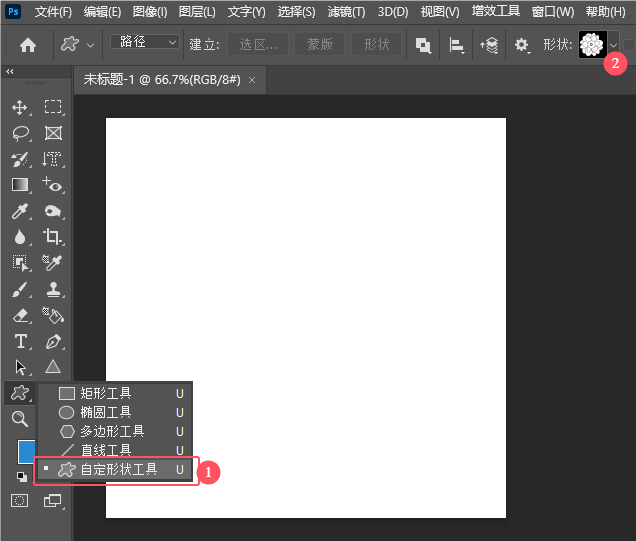 3、然后点击工具栏里面的自定形状工具。再点击属性栏上面的形状。