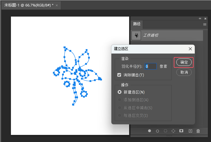 7、弹出建立选区,设置羽化半径为:0像素,点击确定。