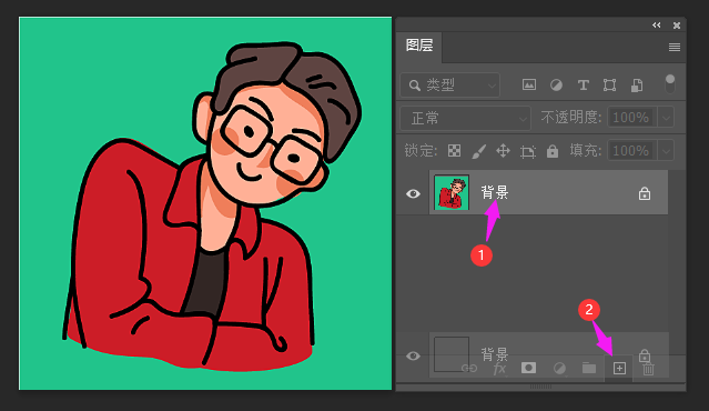 1、鼠标点击【背景】层不放,拖动图层下面的【+号】图标。