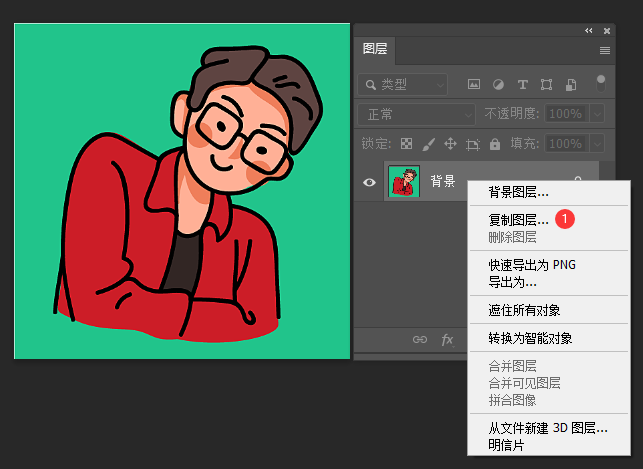 3、也可以右击【背景】层。弹出【对话框】,选择【复制图层】选项。