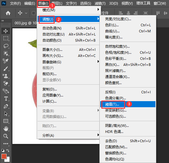 2、然后点击【图像】菜单,点击【调整】里面的【阈值】工具。