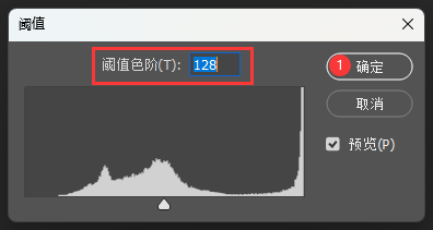 3、弹出【阈值】面板,设置阈值色阶参数:128。点击确定。