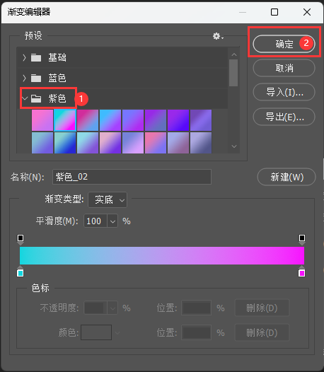4、选择渐变编辑器,选择紫色里面的效果。点击确定。