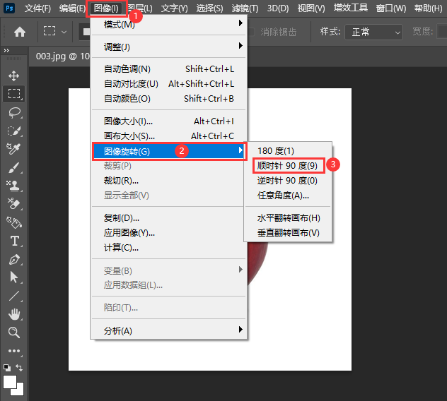 2、然后点击图像菜单,点击图像旋转,再点击顺时针90度。如下图: