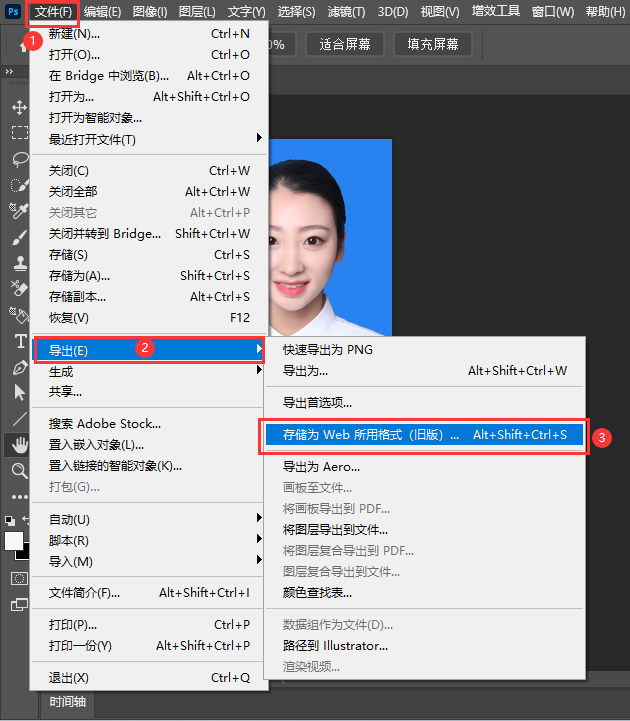 2、然后点击文件菜单,点击导出菜单,点击存储为WEB所用格式。