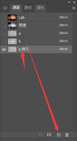 6、进入通道面板。选择a通道不放,拖到新建图层+号上。得到a拷贝图层。如下图: