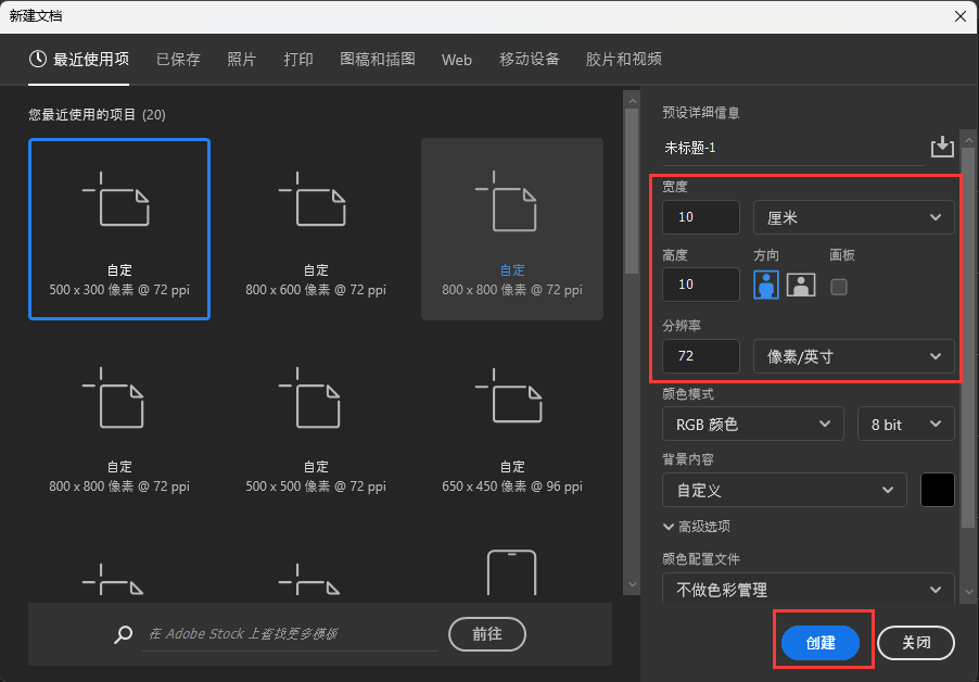 1、打开PS软件,点击新建文档。设置宽度与高度为10厘米。点击创建。