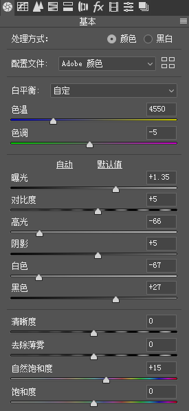 4、降低高光和白色,提高黑色数值。找回高光和阴影部分细节,增加一些自然饱和度。现在照片曝光就正常了,但是还是会有些发灰,继续调整。
